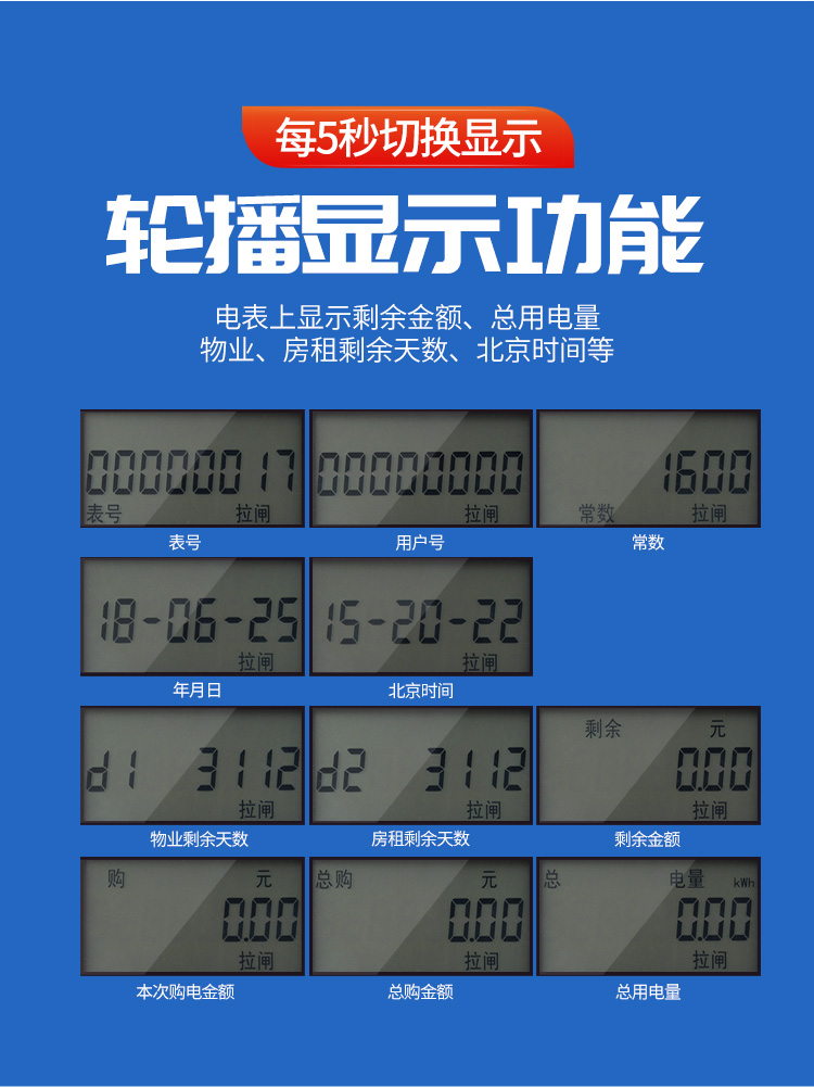 (2)預(yù)付費電表的功能:經(jīng)典款電表是上顯示剩余電量、總用電量等,1代物業(yè)版電表上顯示剩余于金額、總用電量等,2代物業(yè)版電表上顯示剩余金額、總用電量、物業(yè)、房租剩余天數(shù)、北京時間等具體功能如下。