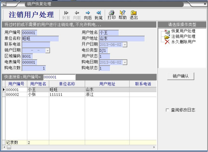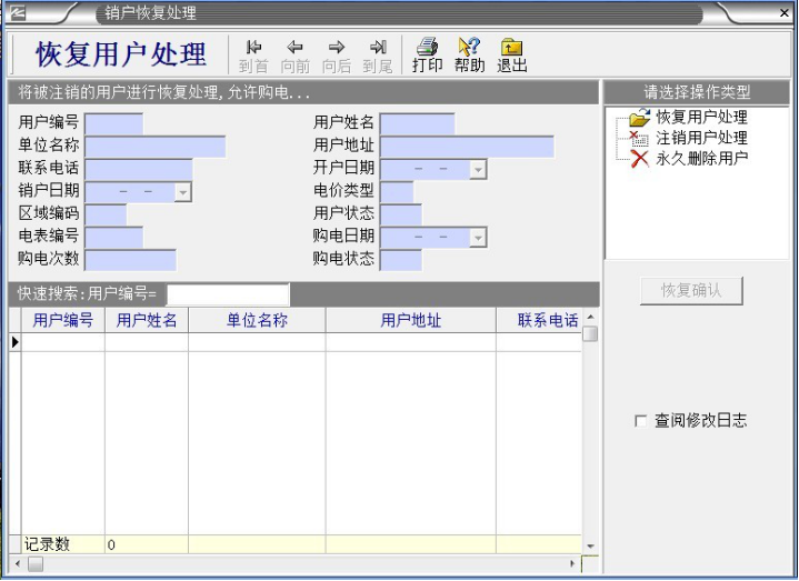 ,鼠標左鍵“銷戶恢復處理”,出現(xiàn)以下對話框:
