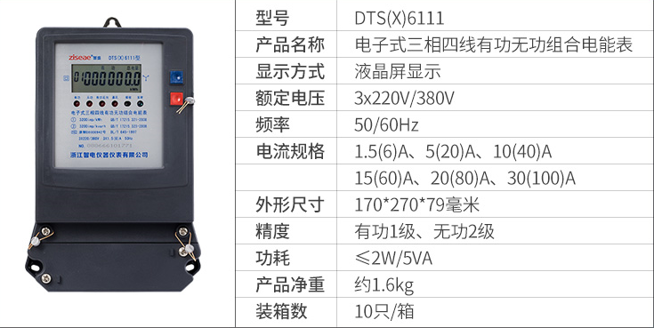 DTS(X)6111、DSS(X)6111型三相電子式有功無功組合電能表(以下簡稱電能表),是為了適應電網改造設計開發的有功、無功組合式電能表。它具有較高的準確度和可行性。產品制造標準符合GB/T17215.321-2008《1級和2級靜止式交流有功電能表》、GB/T17215.323-2008、DL/T614-1997《多功能電能表》、DL/T645-1997《多功能電能表通信規約》等電力行業標準對三相靜止式電能表全部技術要求,是對需要進行無功電量考核的企業、變電站或電廠理想的選擇,亦適合輸配電或配網自動化用表。本產品可供計量參比頻率為50Hz電網中的三相交流有功和無功電能,并能進行正、反向電能計量和紅外及RS485通訊功能。其特點是精度高、可靠性好、寬負荷、低功耗、誤差曲線平直、抗干擾能力強。