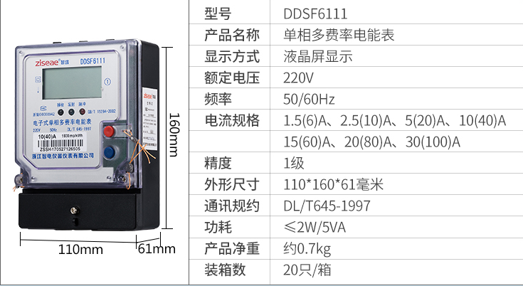 DDSF6111單相電子式多費率電能表,采用單片機處理系統(tǒng)設計而成,具有電路簡單、可靠性高、成本低等優(yōu)點。該產(chǎn)品軟件、硬件、結(jié)構(gòu)設計技術(shù)先進,計量精度高,結(jié)合單片機資源,實現(xiàn)電能分時計量,具有紅外及RS-485通信功能,抗干擾、防攻擊性能好,工作溫度范圍寬,能長期穩(wěn)定可靠工作。該產(chǎn)品各項性能指標符合國家GB/T 17215-2002《1級和2級靜止式交流有功電能表》、GB/T 15284-2002《復費率(分時)電能表特殊要求》、DL/T 645-1997《多功能電能表通信規(guī)約》等標準的技術(shù)要求。